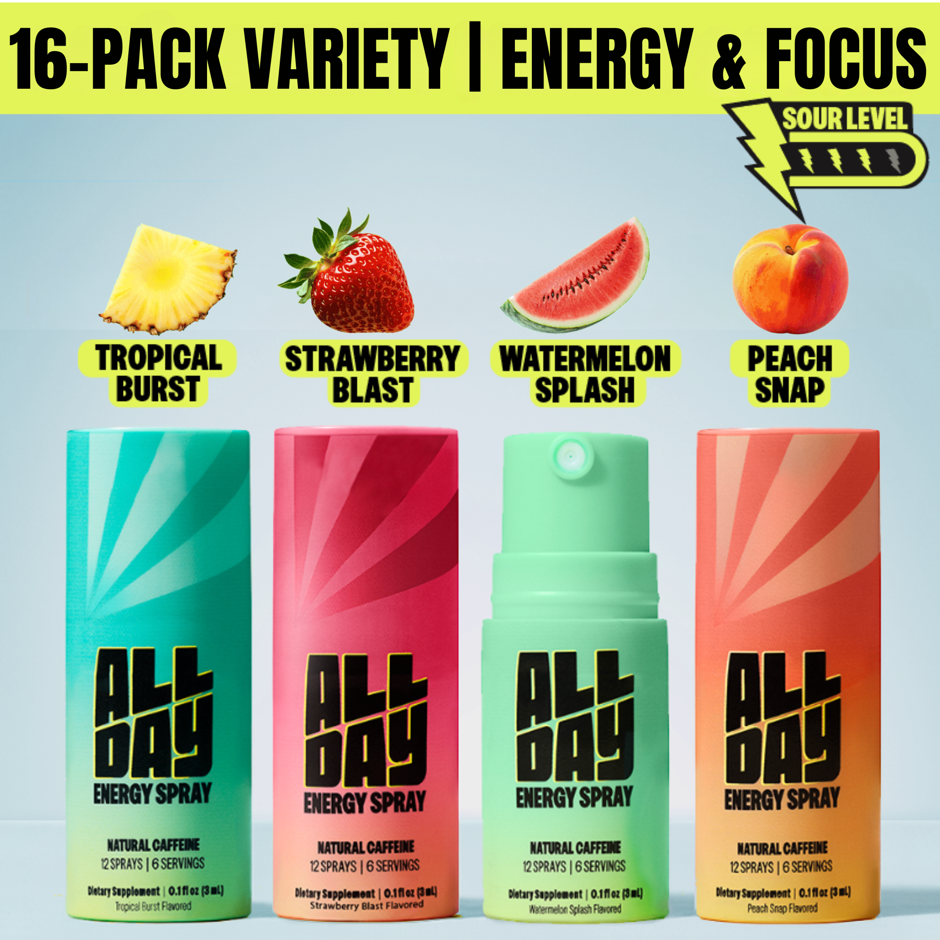 Power up and lock in—anytime, anywhere—with ALLDAY; an energy spray made only with all-natural caffeine.